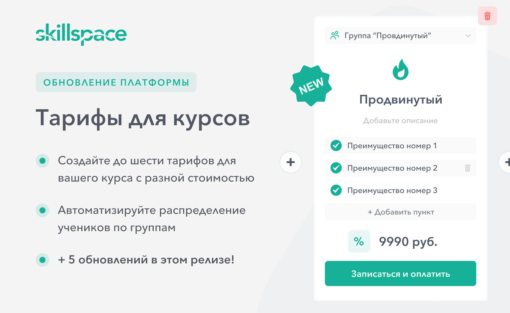 1️⃣ Тарифы для курсов. Создайте до шести тарифов для вашего курса с разной стоимостью, привяжите их к группам с соответствующими настройками доступа/расписанием. После оплаты ученики будут автоматически попадать в группу, привязанную к тарифу.